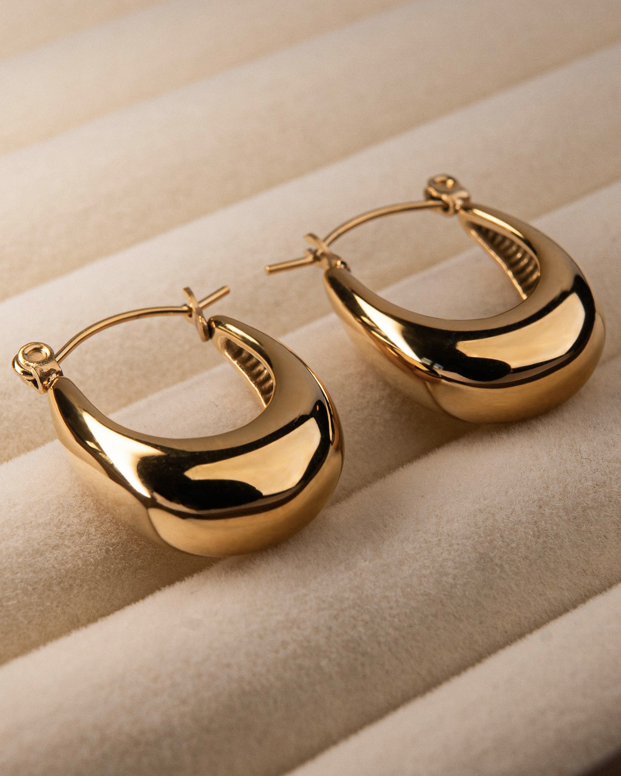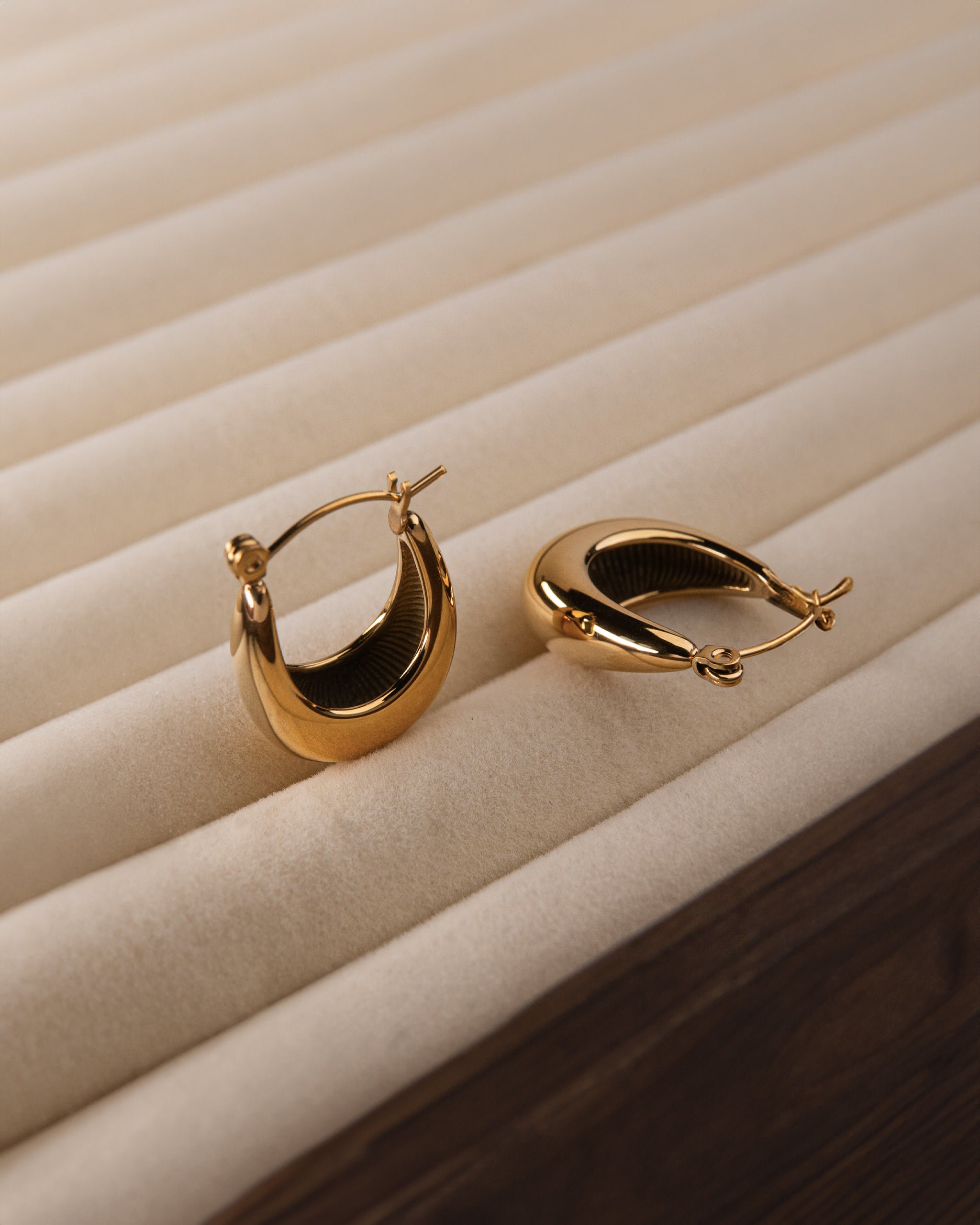Disse øredobbene i 18K gullbelagt rustfritt stål kombinerer elegant design med solid holdbarhet. Lette, komfortable og vannbestandige – perfekte for både hverdag og fest. Den varme gulltonen gir et raffinert uttrykk uten å rope etter oppmerksomhet. Et par du kommer til å bruke igjen og igjen.